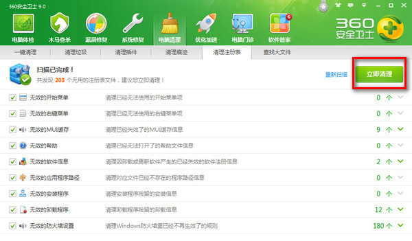 4.等待360安全卫士扫描完毕,可以看到360安全卫士扫描出一些电脑里无效的注册表,然后我们直接点击“立即清理”,清理无效的注册表。