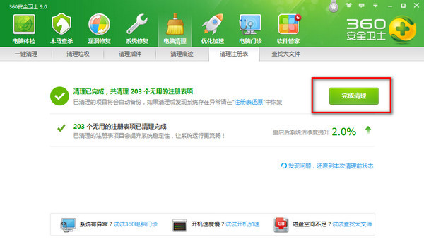 5.等待360安全卫士清理完成,点击上方“完成清理”。